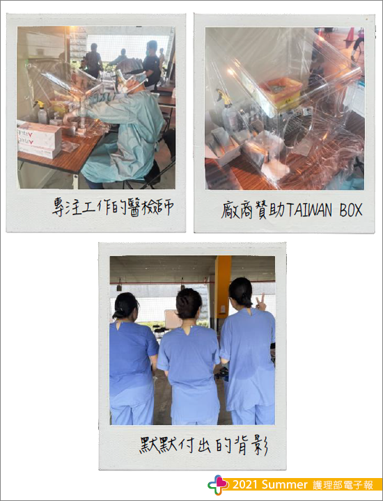 7天下來,西拉雅快篩站共採檢了7,571位移工,其中12位快篩呈現陽性,所幸最後PCR都是陰性,這個結果讓我們覺得好欣慰,快篩站也功成身退。這是一次歷史性的紀錄,體驗到有別於醫院內工作的模式,過程中感受到奇美夥伴們發揮互助合作、彼此支援的精神,尤其護理人力,在護理部召募下,共有近三百位護理師願意加入社區篩檢或社區疫苗注射的防疫工作。這次剛好有廠商無償提供TAIWAN BOX,讓醫檢師在良好的防護設備下進行檢驗,當我們看到鄰近篩檢站僅使用紙箱當作防護設備時,也拿了一個給該醫院使用,我想這也正符合了當時廠商希望互相分享的意義。