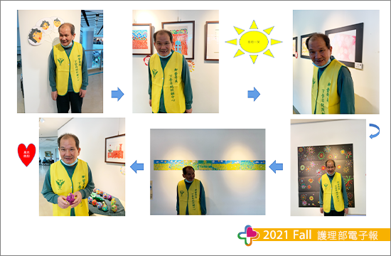 開幕當天我的主要角色–擔任褓母,負責帶領前來參加開幕茶會的爺爺、奶奶到展覽會場–柳營奇美醫院二樓的奇藝角落,雖然我的工作職責是隨時注意他們的需求,但是因為個人主要的臨床護理經驗以新生兒科為主,完全沒有與長者對話、互動相處的經驗,當下我的想法:保持距離、以策安全。於是,我選擇站在角落默默的關注長輩人群,放眼望去看到熱心的醫院同仁主動與會場的爺爺奶奶們寒暄,手輕輕地攙扶並配合他們的步伐,陪他們在展覽會場走動,欣賞同期同學的作品,同時,企圖讓他們在所有展出的作品中找到自已的作品,場面相當熱絡。此時,我注意到一位爺爺,獨自坐在椅子上,眼神及動作看起來有點好奇又有點怕生,腦中突然閃過一個想法驚覺到,或許他是「炎德」,展覽作品上架前我看過他的作品–扇子上的臉,讓我印象深刻,於是乎我鼓起勇氣,懷著一顆熱情的心,向前走動並主動與長者攀談。