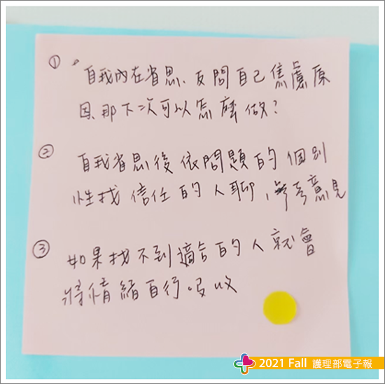 當然最感謝的還是我的主管及學長姐們,讓我有這個機會能參與這一系列的課程,對於一個剛畢業的護理師最重要的莫過於到了一個好的環境,在這裡有著溫暖的團隊帶著我一步一步往前走,從一張白紙蛻變成能夠獨立照護病人的護理師,更期望未來的自己可以變成像學姊們一樣的優秀,並運用課程所學的內容傳遞給病人及學弟妹們,讓願意踏進護理職場的學弟妹們在護理界發光發熱。