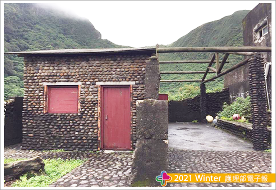 龜山島上的建築式聚落遺跡,龜山島上的建築都是用當地的龜卵石做為牆體,再以茅草跟瓦礫做為屋頂,旁邊的兩層算是富家建築是近代改建的鋼筋水泥建築。