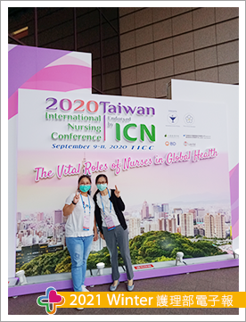 台灣護理學會(Taiwan Nurses Association, TWNA)為了提升台灣護理國際能見度,在睽違15年之久,我們終於成功爭取到與國際護理協會(International Council of Nurses, ICN),於2020年9月9-11日聯合舉辦辦理台灣國際護理研討會(2020 Taiwan International Nursing Conference Endorsed by ICN)」,大會主題為「護理師在全球健康的關鍵角色(The Vital Roles of Nurses in Global Health)」,我也因為醫院及部內的支持能躬逢其盛。在台北國際會議中心(Taipei International Convention Center , TICC)舉行為期3天的學術會議中,共有22個國家(台灣、英國、美國、加拿大、德國、日本、香港、澳門、印度尼西亞、印度、新加坡、韓國、中國、愛爾蘭、以色列、馬來西亞、緬甸、挪威、尼日利亞、菲律賓、泰國、越南)的菁英聚集在此進行跨國際的學術研討,此次以五大主題「護理教育學習」、「病人照顧和護理實踐」、「衛生系統」、「人力資源與勞動力」和「數位醫療」類別的研究成果,用專題、口頭、海報及電子海報方式進行發表,收錄超過1,800篇的學術摘要,其中海報高達1,798篇。