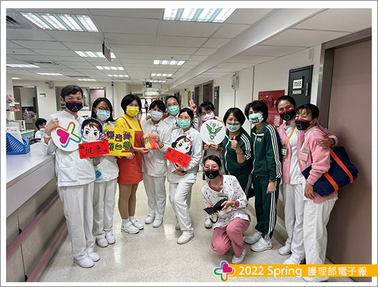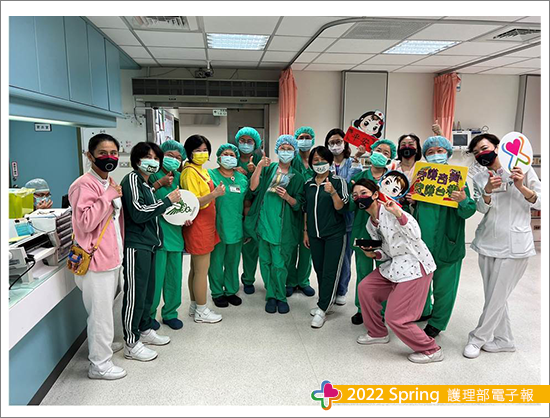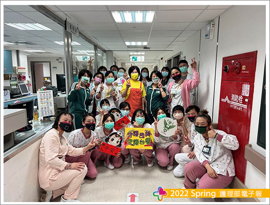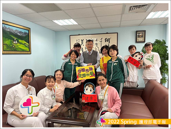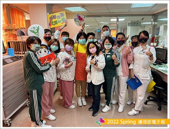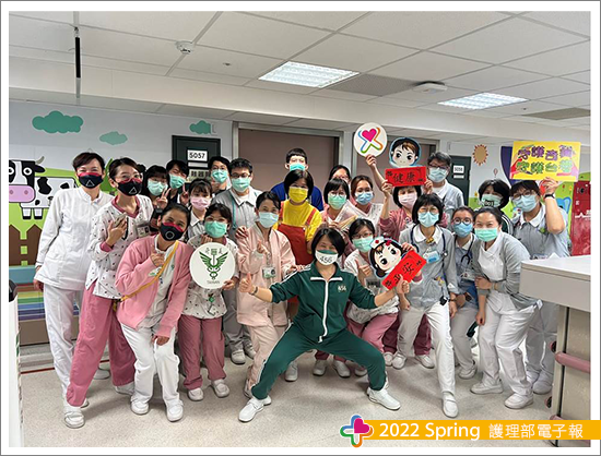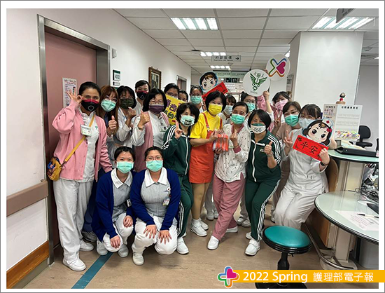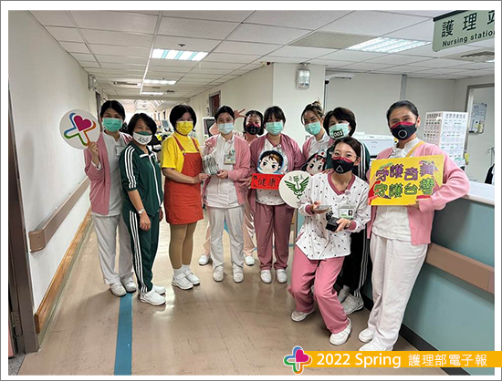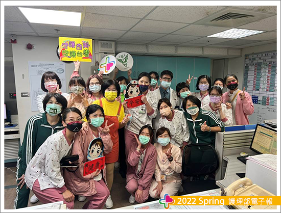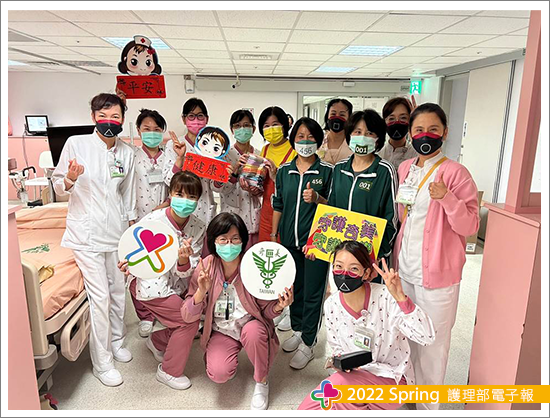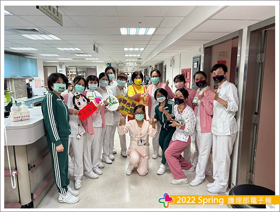 回到總院第一站(居家護理、居家服務、出院準備、長照)➝產後之家➝ER➝12B➝DM衛教室➝12A➝RCC➝10A➝10B(含傷口照護)➝9B(含安寧共照)➝9A➝8A➝8B(含化療小組)➝8C➝7B➝7A➝6A➝輸送➝6B➝6BI➝5CI➝5B➝5A➝4A(含產房)➝SBN(含BR)➝4AI➝4BI➝燒傷中心➝3CI➝3BI➝CSR➝OR➝OPD(含第五醫療門診)➝洗腎室(第五醫療)➝安寧居家(第三醫療6樓)➝最終站--院長室。送愛的路線圖規劃由上而下S形動線方式進行,送愛過程中到達每個單位前,先以配樂(魷魚遊戲影集音樂+過新年祝賀曲)開場,長官們粉墨登場送愛到各單位;過程中,各單位同仁見到特殊裝扮的主管們驚呼連連也非常驚喜,平時看似嚴肅的主管們也報以滿滿笑容與祝福,不需演練也不需台詞地自然流露彼此的情意,讓現場的夥伴們深刻感受到滿滿有形和無形的愛!唯一遺憾的只有部份單位因忙碌,考量不造成單位困擾與負荷而略過。當天任務的最後一站-院長室,更讓陳副及馬部二位長官來了一段即興KUSO版的防疫筆功能介紹,逗得大家哈哈大笑!讓走了三個多小時送愛活動的大家都忘卻了一下午的疲憊感,也為這一份任務畫下完美的句點。