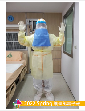 另外,印象最深的體驗是,這一年因為疫情的關係,常會在新聞上看到身穿全套防護衣辛苦的防疫人員執行檢疫工作,原本都覺得防護服像一般隔離衣一樣,沒什麼特別,實際體驗後才真正了解前線人員們穿著防護衣的辛勞。剛好實習期間單位在進行防護衣的穿脫考核,臨床教師們也讓我們一起上課及體驗。剛穿上全身防護衣,戴上N95口罩,在空調環境下,我都還沒有活動就已經在流汗、一說話就覺得喘,更何況在戶外的防疫人員要全副武裝的工作。但最大的挑戰是脫下防護衣,因為已經接觸的病毒,正確脫下才能避免讓自己暴露在風險中,這時候就除了動用身體外也會用到腦袋思考,因為防護衣內側乾淨的,要如何不讓自己的手及外面的衣服碰到自己,是件考驗功力的事,尤其是脫到腰部以下就要特別小心自己會不會因為姿勢而不小心碰觸到,讓自己暴露在風險中。謝謝單位能有機會讓實習生體驗,讓我能實際體驗穿著防護衣在前線的防疫人員,雖然那麼辛苦,但是還是一樣在前線工作。