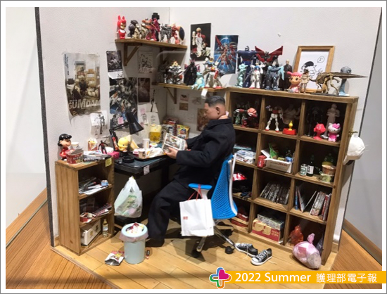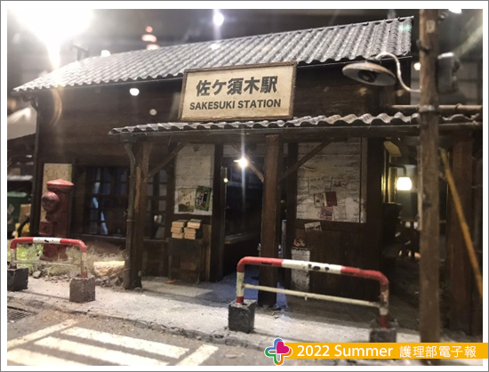 讓我們來看兩件作品。「疫情指揮中心」,這件比例為1:20的作品,是2021年9月的創作,作品中的亮點是電視,它是以2.5吋的小螢幕改裝而成,由於場景是國家級單位,以及「現在進行式」的情境,畫面呈現需要有一定的「乾淨度」,因此,本作品花了不少時間「做新」,而非如其它創作可隨時「合理的舊與亂」,這是展場中少數「不舊化」的作品。身為醫護人員,對於這兩年收視率最高的直播場景,想起同在醫療現場為抵抗疫情而奮鬥的同仁們,心有戚戚焉啊!