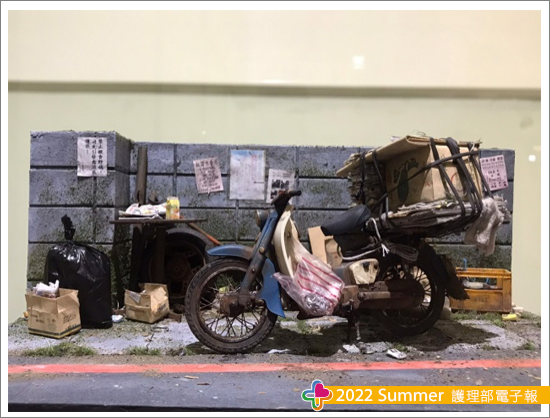 另一件則是「回收伯的夏天」,這件比例為1:12的作品,作者的創作原意是企圖喚起人們對老人照顧、資源回收的關注,街角的一隅看似凌亂、蕪雜,殊不知,是模型師的精心設計,鏡頭如實還原了台灣的街景現場,某種角度上而言,那不是藝術,那是我們生活的某個剖面,只是人們生活得過度安逸,忘記那是最尋常的生活,也忘記要珍視與愛惜了。