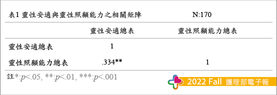 加護病房護理人員的靈性安適總得分80.25±8.59分,經百分比計算平均得分66.9分,兩個結構面分別為宗教安適得分39.74±5.08分,存在安適得分40.05±5.02,屬於中等程度。整體靈性照顧能力總分62.38±12.463,以百分比計算平均得分56.7分,單題總平均為2.83分,依Likert Scale五分法,介於「很少」、「有時」,顯示本研究護理人員對病人的靈性照顧能力偏低。宗教信仰、自覺身體健康狀態於靈性安適上有顯著差異;年齡、職稱、年資、加護單位、教育程度、2年內靈性照顧上課時數於靈性照顧能力上有顯著差異;加護病房護理人員的靈性安適與靈性照顧能力呈顯著正相關如表一。