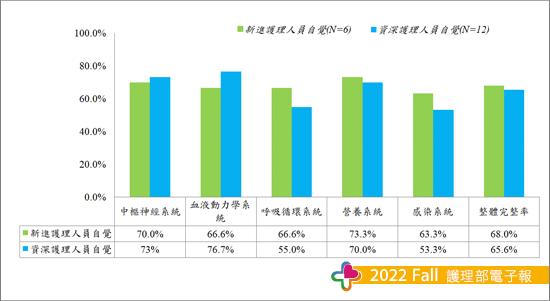 專案小組實地查核6名新進護理人員與醫療團隊查房報告病況,查核發現「新進護理人員系統性交班檢核表」整體平均完整率75%。並對6名滿3個月試用期新進護理人員及曾與新進護理人員交班的12名資深護理人員(工作年資≧4年以上),以加護病房系統評估架構由上至下,依序為:中樞神經系統、血液動力學系統、呼吸循環系統、營養系統、感染系統之現況進行回溯系統性交班完整性調查,以李克特量表(五分法進行查檢),如圖一。
