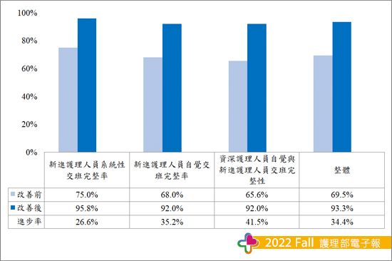 透過創新教育訓練與教師教學臨床情境結合、透過團隊間溝通以系統架構做連結並建構線上學習、施行交班單與交班模式,改善後交班完整率上升至95.8%。建議未來加強病人端照護量能,進而展現照護品質效能。
