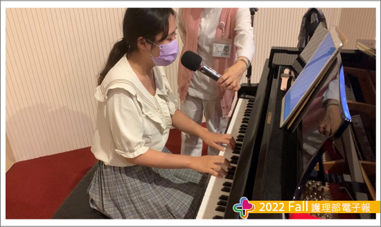 另外,考量近年疫情因素,規劃時朝靜態的方向來設計,所以我們透過往年榮獲南丁格爾獎、傑出護理人員獎、醫療奉獻獎中的幾位優秀得主進行邀請,分享主題設定為「護理養成記」,運用現今最熱門的TED演講型式來分享自己從事護理工作的旅程與啟發,增添活動中的知性與文青氛圍;為了感謝與撫慰所有第一線護理師的辛勞與貢獻,我們邀請到任教在多所學校的吳家榆音樂老師,為奇美量身打造詞曲創作,誕生了「一起美麗」這首奇美護理之歌,家榆老師把「奇美」兩個字的諧音藏在歌曲中,注音聲調雖然不相同,但唱起來的音調會是一樣的,也希望大家在疫情下能持續保持勇敢美麗(圖二)。另外,也蒐集了各單位護理同仁在臨床上晝夜不分的堅守崗位,即使在大太陽底下也仍穿著密不通風的隔離裝備多張照片,製成二部防疫影片,預計搭配家榆老師鋼琴演奏「向日葵祈願」與「Love infinity」,期望藉由防疫影片與優美的琴聲飛揚,感謝與溫暖大家的心。