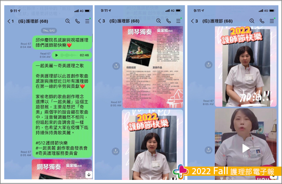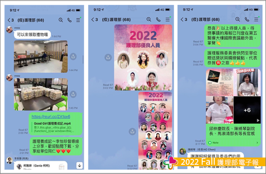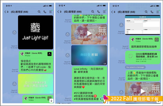 5月12日屬於護理師的日子,當天準時8點與16點全院廣播出邱仲慶院長對所有護理同仁的祝福,許多當下在臨床上忙於照護的夥伴們都停下來,聽到廣播時心頭頓時一陣暖流湧入,接續背景音樂搭配「一起美麗」音符流串在醫院各個角落,相信大家的內心十分感動!接續由陳綉琴副院長及馬淑清部長親自錄製祝福與加油的影片,護理部的大家長感念各位夥伴在這艱困的時刻,持續堅守崗位為病人家屬盡一份心力;接著,客製化屬於111年的傳燈儀式,只要透過手機掃描QR cord,就會出現奇美護理部Logo的動態傳燈圖片,也利用電腦隨機抽抽樂,送給幸運中籤的夥伴們一份美味可口的精緻餐盒。接著,連續撥放二部防疫影片,細數大家這一年來在臨床上工作與防疫的點滴;播放過程中單位氛圍變得非常溫馨、催淚,同事們看完影片,眼角都濕濕的,心中充滿深刻的感觸跟感動。李怡珍督導錄製的「Good(骨) Girl養成記」,分享許多臨床照護上感動的故事跟值得學習的金玉良言,有著培育傳承的濃厚意味(護理部主管LINE群組推播畫面如圖四)。