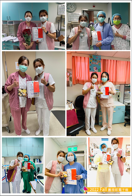 最後,由護理服務委員會柯雅婷督導帶領下,快閃至單位頒發優良人員獎狀禮品,希望彌補已取消的實體頒獎儀式,讓受獎同仁們仍感受到護理部的用心策劃安排(圖五)。此次的活動經驗讓護理服務的委員們獻出許多的第一次,這樣的經驗相當寶貴;在屬於護理人員的五月天,感謝所有護理師給予社會堅定的力量,祝福大家平安健康喜樂,祈禱疫情早日平息,期待明年的護師節到來~我們,明年見!