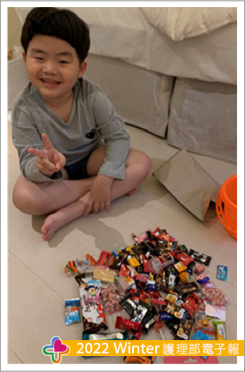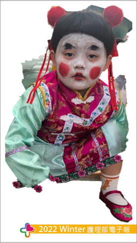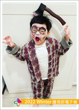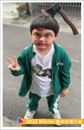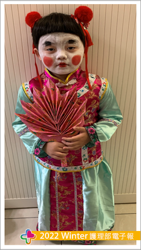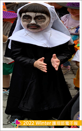 搜尋這些知識後看著自己約5個月大的小兒就暗自下決心也要讓他有個不一樣的「哈囉喂」,終於在108年小兒幼稚園小班讓我等到有理由扮鬼的活動,第一次的扮鬼我原本擔心小兒不願意配合,但出乎意料原來小兒也有諧星的淺能,所以重口味的我們第一次幼稚園萬聖節扮鬼角色「鬼修女」登場(圖一),隔年讓我滿心期待這個整小孩的節日到來,既然去年扮西洋鬼今年就來個中國鬼好了,就這樣「玉女」誕生(圖二、圖三)。