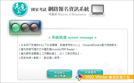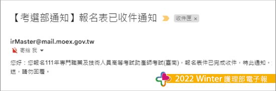 報考的準備工作,高等考試採網路線上報名,使用電子資訊進入考選部登入國家考試網路報名資訊系統(圖1),依照網路訊息,確認考試報名時間、依線上報名系統完成個人資料登入及相關文件(畢業證書、學校成績證明)的準備,將紙本證明文件寄至考選部進行考試資格審核,考試院工作人員會以電子郵件通知(圖2)報名進度。