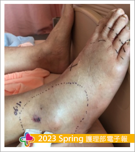 每小時運用6P評估探視個案監測左下肢傷口紅腫情形,用筆畫虛線註記,並使用布尺測量腿圍記錄腫脹範圍。密切觀察個案肢體腫脹情形及施打抗毒蛇血清後引起之副作用,預防潛在危險性傷害發生。