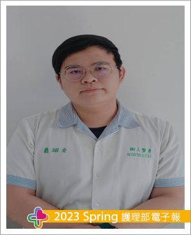 頃刻間一整年的護理實習即將結束,沒想到這一年的實習是這麼的特別,第一站與最後一站都在佳里奇美5A內科病房進行實習,可以讓單位護理長、學姊及學校老師共同目睹,我從懵懵懂懂的「阻手」變成可以幫助病人的「助手」。剛到單位的時候,緊張及興奮的情緒一直在我心中徘徊著,從熟悉單位用物開始,就讓我非常頭疼,因為東西好多,雖然擺的很整齊,但總是無法找尋到自己想找的東西,所以也從這一天開始,我默默的做起筆記,也會將庫房內的物品擺放位置給畫起來,加上常常主動備物,真的很快我就將物品都大致記起來了,經過這次的經驗後讓我得到啟發,知道不論是實習還是未來臨床上,遇到問題時就面對它、理解它並找方法解決,這讓我對臨床護理開始深感興趣,一直思考著也許我能從更多的事情,獲得更多我想要的禮物。還有!剛開始實習的我就像隻無頭蒼蠅一樣,很多臨床的技術與知識都不會,在學姊及老師的帶領下,讓我學習了很多,讓我慢慢的成長成為一位成熟的護生,讓我知道技術與學理都是很重要的,很謝謝學姊們可以在這麼忙的情況下,一直都有很高的教學熱誠,讓我學習非常的多,也讓我成為學姊的得力助手,是病人家屬能信任的小護生。