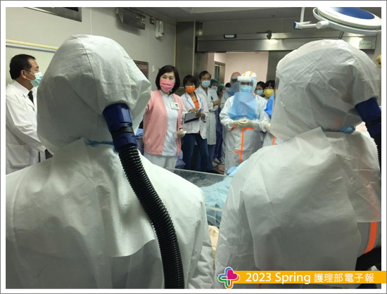 回想去年的6月28日,因應原本為2樓門診手術室的29房被指派為Covid-19防疫手術室,因此進行了一次大規模演練,為的就是超前佈署等待需要使用的那天來臨,演練前後期間團隊不斷進行開會討論,目的地只為確診病人打造一間真正能讓團隊放心執行手術的環境。疫情期間,手術室29房為確診且必須緊急手術的病人使用,但因為29房硬體設備本為門診刀使用,因此手術環境有其限制,所以手術進行會增加許多困難度,也因此護理人員必須更增強專業訓練,而透過單位主管加強人員的知識、修正人員的態度,以及增進人員穿脫隔離裝技能中,人員在各方面的行為修正及確診病人手術作業規範的制定中,於2022年5月12日凌晨777完成了第一例確診個案剖腹產,爾後陸續於29房完成各科確診病人的手術,統計至2022年7月總共完成了36台手術,而手術期間的人員調度及籌備接刀過程,包括挪移2樓門診手術室的病人至3樓手術室繼續完成手術,中間的過程需要主管不斷的進行團隊的溝通,包括麻醉部門、手術團隊(手術專責、手術團隊、醫療相關團隊)都必須介入,而主管及手術室控台人員必須戰戰兢兢地為每一台刀做檢驗資料的調查,環境的檢視及配備是否齊全,要讓醫療團隊的每一位人員感到安心且能放心執行手術。每一台確診刀,人員都必須全程穿著PPE隔離裝,從手術前準備、手術中及等待後送病人過程,期間人員必須忍受著手術時間的冗長及嚴格無菌技術下,術後環境清消及手術器械的歸還,人員都必須親力親為,為的就是讓病人能在醫療團隊下順利完成手術,也讓手術後的環境是安全的。