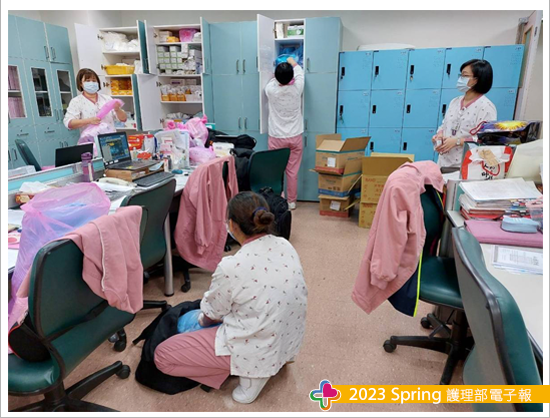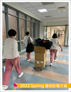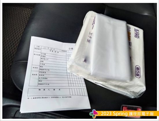 4月29日午後,當我掛下這通電話,試圖掩飾我心中的不捨,忐忑的自問自答:老天爺常常這樣考驗著我,正值準備衛生局督考之際,再錦上添花一樁,但凡事該來的還是來了,自己先幫自己打強心針吧,接續再穩住並帶領居護團隊面對一切,我試圖用最沉穩的語氣轉達「明天開始啟動分艙分流」,我腦海裡閃過千萬種的應變模組、該如何安排人事物的樣貌,哪一種方式對人員最好?我心裡真的沒有底,但我還是想聽聽大家的聲音,想要更周全的共識我們最期待的運作方式,開會吧!各位居護師,身為主管知道大家怕什麼、不方便什麼、限制很多、不願意面對什麼…,所以我們檯面上解決,不要存著疑惑往下走,讓時間先暫停在這一刻,我沒有把握,我也希望把妳們最不願意面對的任何事物先留給我做,會議一開始,我心裏是心存感激的,我的居護師第一句說:「阿長,妳要留守醫院坐鎮」,我們分艙出去,雖然一人一句、臉上還能談笑風生,我也知道彼此藉此開玩笑樣,在舒緩不安及莫名未知的壓力,很快的~我們共識分艙分流的人事物規劃,但我要提點的仍是各位不管妳在那裡,答應我先照顧好自己、先照顧好家人,我們居護會是彼此的後備支援,我們面對的是病毒、不是人心,儘管社區風險很高,儘管未來確診了也不要害怕,只要居護團隊有著心繫在一起的決心,就可以面對無數次的挑戰,下一秒,有人連繫並募集到數個紙箱(圖一)、有人製作公務車清消表(圖二)、有人打包每週衛材表及護師服量、有人整理分艙返家的設備…等,僅能以族繁不及備載形容下班前的一陣混亂,繼之,在居護師合作分工下,用推車無數趟搬運分艙用物(圖三)到自己的私人轎車內,我們內艙的人員揮手致意,衷心期待我們合體的那一天到來,不要太久。