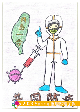 創作理念:在疫情肆虐的這幾年,第一防線的防疫人員身心承受了許多壓力,無論是得在炎熱的天氣下穿著密不通風的防護裝備,好幾個小時無法喝水、廁所,或是擔心自己染疫影響了家人、朋友而不敢回家,更多的是來自民眾的謾罵、不體諒,但防疫不該只有第一線防疫人員,需從你我做起,全民共同抗疫,才能夠戰勝疫情。