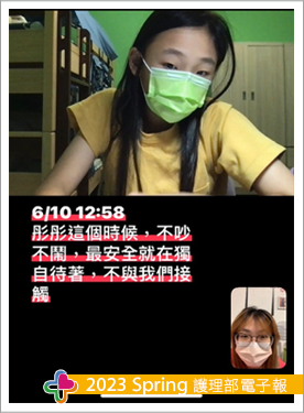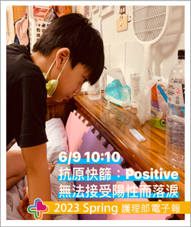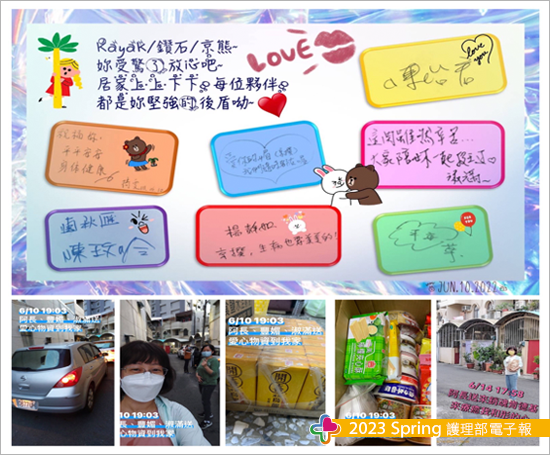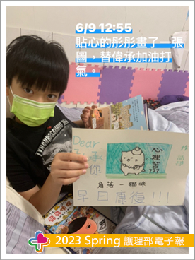 話說,我的症狀輕微:吞口水喉嚨微痛,但不影響食慾,每天攝取一顆維生素C錠,女兒從門縫又遞入一張圖,上課前畫圖送給我(圖一),兒子起床第一件事-快篩,看著試劑第二條線浮現,他默默落淚再擦去眼淚,快篩結果陽性(圖二),6月9日家中第三位確診者,我告訴兒子:『我們的身體真的很努力了,還是抵擋不住病毒入侵,媽咪跟你一樣確診,現在開始想睡就睡、吃多一些、睡飽加心情好,就能把病毒趕出身體裡。』他點點頭表示了解,體貼的姊姊,畫了一張加油打氣圖送給弟弟(圖三)。隔天先生突然發燒、寒顫、咳痰、咳嗽、肚子痛及全身無力樣樣來,我心想該不會陰性轉陽性?立馬快篩,結果:陽性,6月10日家中第四位確診者,下午先生進入昏睡模式,兒子退燒就安靜地看書、玩樂高,我們三人一室,僅剩未確診者的女兒獨自關在房間裡,藉由視訊不定時聊天,她的面容看上去疲倦、明顯的黑眼圈(圖四),透露想確診跟大家在一起,我說:『學舞蹈的孩子,身體果然很好,到現在都沒有什麼症狀,妳真的很厲害內!』,不知道有沒有安慰到孤身奮戰的她,再多一個人確診,也多一份擔憂,我衷心期盼女兒不要確診。下午,同事捎來關心的訊息,提到怡君護理長自掏腰包備妥「防疫物資」一箱與打氣飲料、自告奮勇親自到府送溫情,同事也誇獎女兒勇氣可嘉,一定要好好鼓勵她。我站在門口內,看著她們的身影、手裡滿滿愛心食物,『雪中送炭』是我當下內心的寫照,腦海閃過4月網路報導標題:『身邊沒感染者代表你沒朋友』,嘿~我有朋友喔!擁有這群觸動我心的朋友,一生可遇不可求的幸福感(圖五)。今晚,看著姐弟倆吃的津津有味、笑顏逐開,『美食』果然能夠撫慰人心!兩天後,女兒說她頭痛、體溫37.6度,我問她:『有症狀了,妳想快篩嗎?』,女兒忐忑不安點頭,第二條線很快出現了,快篩結果:陽性,她哭著說:『我不想確診,這樣我不就是隔離最久的人?』、『那我不就少上四堂舞蹈課?』,6月12日家中第四位,也是最後一位確診者,她是我們家撐最久、也承受最多心理壓力的人,難為女兒了!