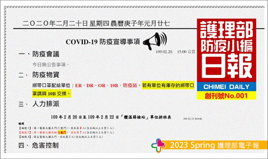 2020年農曆春節過後,台灣迎來了第一例COVID-19個案,衛生福利部偵測到危機後立即性的做出防疫應變,由中央流行疫情指揮中心每日召開記者會,有關國內疫情發展及防疫政策等爆炸性資訊,如同雪片般飛來,一線醫護人員同時接受了大量的中央資訊與醫院內部滾動式檢討防疫策略調整,讓醫護人員醫療資訊負荷瞬間超載,為了能減輕臨床負荷,並讓同仁能接收到經過消化整理的訊息,「護理部防疫小編報報」因此誕生了。