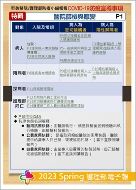 今年7月隨著防疫政策逐步走向日常化,因此「護理部防疫小編報報」也開始新紀元的轉型,積累了兩年多的經驗系統性配套措施及應變措施已然成形,但因為因應情境而有所微調,單靠單一重點式的整理,容易見小樹而不見樹林,因此為了因應臨床實務上的需求,小小編們將訊息統整出一份特輯(圖3),並將全部內容架設至雲端資料庫,除了方便查找目前最新版本,也能了讓全年無休的主管們可以找到適當的資訊,並快速解答護理同仁的疑問。