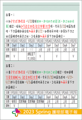 每當有重大記者會或防疫會議結束後,身為「大編」的督導們則會快速整理那些是護理部內同仁需要了解及配合的,並將相關資訊交給小小編們做分類、排版,除了政策傳遞,同時也需要澄清容易產生混淆的政策,或是統整近期同仁最想知道資訊,並以資訊簡化與易懂性為出發點,使用色彩標示、表格、圖像、分類歸納、換句話說、舉例、聯想以及超連結QR-code…等方法盡可能讓同仁加深記憶或減少誤解,同時也感謝單位主管與同仁的細心與回饋,讓「護理部防疫小編報報」的內容更加周全,期間馬淑清部長不僅協助審稿,以創意教學為使命,提供了不少風趣幽默的點子,例如加強病室管理中的「垃圾袋顏色記憶口訣」,或是舉例「小淑、小清的故事(圖4)」來說明密切接觸者情境及對應措施。
