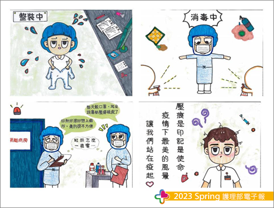 在嚴峻的疫情時刻,穿戴著層層防護裝備,即使汗流浹背,仍一邊賣力照顧病人,一邊守護最前線,持續堅守崗位的醫護人員們。長時間的工作下,因佩戴N95口罩而導致臉部腫脹、耳朵發紅破皮,如同一隻小花貓般,甚至一整天下來根本沒法上廁所,因為隔離衣穿脫實屬不易,我們每天辛勞的奔波,以專業的照護陪伴病患家屬,一肩扛起這重責大任,就是希望疫情趨緩,即使再苦再累,這也是我們未完成的使命;我的人生體會:期望大家能繼續給予支持及力量,讓我們看見真正的價值體現,由醫護人員守護著你們,由你們守護著醫護人員,讓我們站在疫起!
