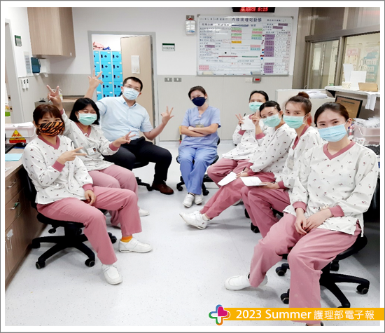 「專責病房」裡,每天湧入數以萬計的訊息、隨著國家公告政策條文、滾動式調整照護配比、處理個案或家屬有理與無理的抱怨,這裡有扛得住的護理師、專科護理師與專責醫師,更能有條不紊處理確診病人相關的人事物;例如:某病人要A(B)艙動線出院?出院交通工具要防疫救護車或計程車?某家屬要採3+4或0+7?病人解隔要採PCR 還是快篩?好在,工作內容的調整、政策在檢討中修正;專責病房有愈來愈多的生力軍加入;病房中的傳送姐兒讓防疫物資充盈、照服員的加入,減少護理師的工作負擔、簡化院內流程,讓專責病房的床位有更好的運用、開放視訊門診、讓陪病家屬或外傭,能夠更即時獲得醫療照護。謝謝妳(你)們無懼無畏站在前線,妥善照護確診個案;讓家(佳)人安心,(里)民放心,齊(奇)心協力、獨善其(美)。