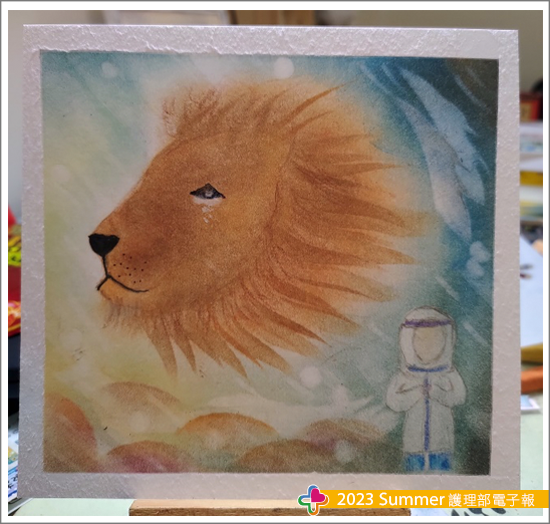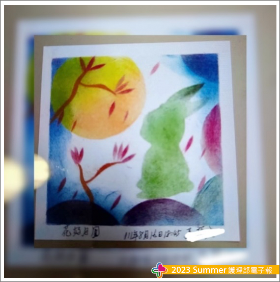 第一線,最貼近病人的一切情緒與需求,當我在隔離房看見意識清醒的病人,聽著他們訴說著種種心情,被隔離的心情壓力、擔憂難以言喻,而我始終思索此時此刻的我,能做點甚麼,因為此時除了病人症狀治療,最需要被關心的莫過於心靈層面,而這部分我想也是最有挑戰的,然而思索在環境限制下,我能提供甚麼,想一想,我會的粉彩畫,怎麼帶進去隔離房內,那是不可能的事啊,經過一段時間,打破了自己原有的想像,我在外面將粉末準備好就好啊,不用全部帶進去,就這樣,某日,詢問病人是否願意給我一點時間,讓我帶他作畫留下一點心情,殊不知病人也立馬答應我,因此我就用了最簡單的一張畫紙及些許粉末,細說引導病人一步一步完成簡單的畫作,當病人完成時,開心的表情,深深烙印心頭,最後引導病人簽名取名,完成屬於自己此時此刻的心情故事,中秋,花好月圓;而面對自我內心,穿兔寶寶裝畫粉彩,或許我可能是第一人吧(笑),顛覆以往單純用手作畫,隔離房內必須得隔著層層手套,隔離裝之下也是汗流浹背,考驗了我的耐力,反思我能為病人做的除了臨床常規外,還有甚麼?臨床的忙碌,我們也容易忽略了病人的心靈層面,焦點往往會是放在疾病本身,而透過粉彩,來增加一點不同的氛圍,病人也因此看見不一樣的自己,因為都沒想過自己會畫畫,單純透過手指簡單的塗塗抹抹就完成一幅,留下的是一項回憶與記憶,疫情,讓我們思索,讓我們改變,更是讓我們成長,因為這場戰疫沒人知道何時結束,而處於當下的自己,唯有透過找尋方法,去面對,去釋放,我想如果匆匆歲月,多年過去,再回頭看看當時的自己,一定是疫難忘。