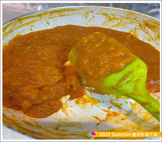 一開始皮剝了肉切不下來,全部都被纖維卡住,後來索性直接用手搾汁,多少有一些果肉可以擠下來,但記得一定要戴手套榨,因為我第一次榨沒有戴手套,整個指甲裡面都被染色,超黃超可怕的,榨了二十多顆後差不多一鍋的量,開始煮時認真覺得熬果醬真的很花時間,要有耐心,廚房又很熱,通常二十幾顆的土芒果需要熬兩個小時,才會變得跟外面賣的一樣,吃起來濃稠香甜,兩個小時也不能走開,要保持攪動鍋底才不會糊掉,所以我建議邊做邊追劇才不會無聊,而且時間過得比較快喔,火一定不能太大,不然滾的時候手會突然被噴到非常燙,熬到像圖中這樣就能到旁邊放涼了,直接吃又甜又香,有牛奶鳳梨的味道,做白饅頭或是吐司的夾心也很搭,弄給我姑姑吃之後,他說比外面做的還要好吃。