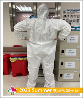 在專區共支援約一個半月,在這期間穿防護衣步驟(圖一)由感到繁瑣,逐漸變成得心應手,上班期間由感覺悶熱轉變為習以為常,我與專區同事的關係也逐漸熟識,由客氣、官方,變為可以互相幫助、苦中作樂的朋友關係(圖二),在專責病房常因隔離因素,如果遇緊急、困難情形,外面的同仁很難立即給予幫助,需要經過層層關卡才能協助我們,因此在汙染區內的同事間互助更顯重要。因確診病人屬於綜合科,曾碰過確診產婦,夜間要執行胎心宮縮監測,也使我們一群內外科護理師久違拿起監測儀器,回想以前所學慢慢摸索成功,在專區內,我們靠著彼此的幫忙、鼓勵,完成一件件不可能的任務。
