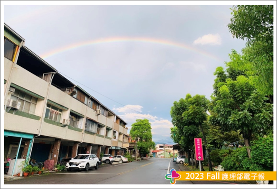 「麗瑜,要出門上班了嗎?小心騎車內。」、「麗瑜,你下班了哦?這個菜給你拿回家給媽媽煮。」從醫院下班回家,疲憊的身總是能從熱情的鄰居伯公如此精神的招呼聲中獲得一些力量,然而再也聽不見了,從小就對我如家人關心備至的鄰居伯公在今年因身體不再健朗逐漸出現阿茲海默症,顧及伯公的安全,伯公家人安排讓伯公住進了安養中心,伯公的家人說伯公還是時時叨念著我,因應疫情政府訂定了探視規定,防疫如同作戰,而身為醫療人員是最重要的戰士,未來疫情發展難料,必須盡可能保全醫護人員安全,以維持醫療量能不受疫情衝擊,因此遲遲一直無法去探望,直到最近疫情稍加趨緩,與安養中心連繫後,決定以遠距離的方式去探視伯公,一切在防疫規範裡,站在圍籬外的我,看著照護員推著伯公出來,伯公一眼就認出我,喊了我的名字,我內心充滿激動,一如往常開心的與他話家常,雖然阻隔著一道牆,但卻阻隔不了見到一面內心彭湃的情緒,去看伯公的那天下午下了一場雨,雨後出現了清晰可見的彩虹,彩虹半空中彎曲的形狀,將大地與高空相連,雲縫中透出一絲陽光、清新的空氣結合,象徵著美好與希望。