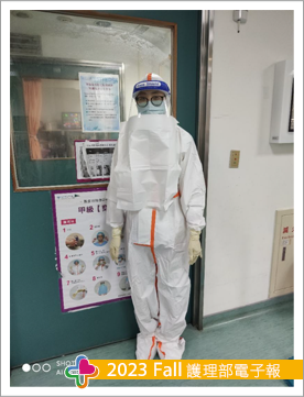 第一次踏入6B專責重症單位,除了環境不熟悉外,照顧COVID-19確診病人也是我的初體驗,所以心情十分緊張(在來之前有尋問過其他人,大多回答很熱、很渴,所以心中已做好萬全準備了)。一早交完班後,看著牆上嚴重特殊傳染病肺炎甲級隔離防護裝備,慢慢著裝完畢(不誇張穿了20分鐘,看著旁邊的人迅速穿完衣服,且不用看圖,心裡真的由衷佩服)。踏入二道門後,開始覺得眼花,怎麼人、事、物都這麼模糊,不疑有它,開始做治療(給藥、翻身、整理衛材...等),不誇張不到9點,我已汗流滿背,站著都可以感受到自己的急促呼吸音,腋下汗水的也不自覺如自來水般滴下,心想這比花錢的「太空艙」還要有用吔,但也不需要這樣啦!11點離開「大型太空艙」後,因全身溼透,踏入病室的第一個感覺,好冷,往下一看,我的內在美都被看光了,而且當場有護理師、醫師、專科護理師,頓時雙手環抱雙胸,快快步出現場,換了套新工作服。這是在護理生涯中最尷尬的一刻,但相信也是這場疫情下,帶給我從未有的體驗,將是一輩子的珍藏與回昧。