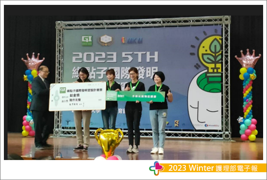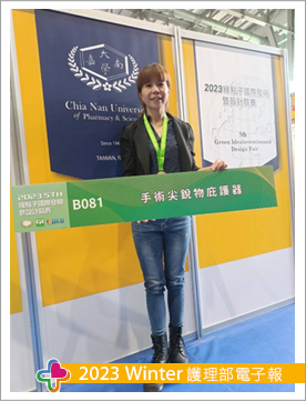 手術科系督導李怡珍對於手術團隊的創意認為需要被看見,因此鼓勵團隊去參加綠點子競賽,把奇美醫院手術室的創意讓更多人知道,只要能被看見創意,就有價值存在,於是在督導協助之下,我們團隊參加了2023年綠點子國際發明暨設計競賽,競賽組別除了我們報名的發明類社會組,還有發明類青少組及設計類組,第一次參加綠點子競賽,觀摩了來自不同的團隊,不一樣的創意巧思,看到大家的無限創意,不一樣的創作來源,激發大家的無限想像,兩組評審來攤位對於我們的創意理念給予肯定及建議,連隔壁AI攤位麻醉科副部長也給予我們肯定,那一刻覺得頭上有光,心中希望被點燃。直到頒獎那一刻,團隊心情其實是激動的,但看到大家得獎作品一一被公佈時,奇美團隊已經陸續榮獲好幾個鈦金獎,而我們卻還在等待,當信心快被打擊時,突然台上公布鈦金獎B081「手術尖銳物庇護器」得獎時,心情如洗三溫暖,開心上台、驕傲領獎,團隊為此時的光榮無比榮耀,不管獎金如何,那是榮耀,那是手術團隊第一次獲此殊榮,頒獎人告訴我們,奇美醫療團隊對於綠點子競賽一直非常踴躍參與,真的是很驕傲的。