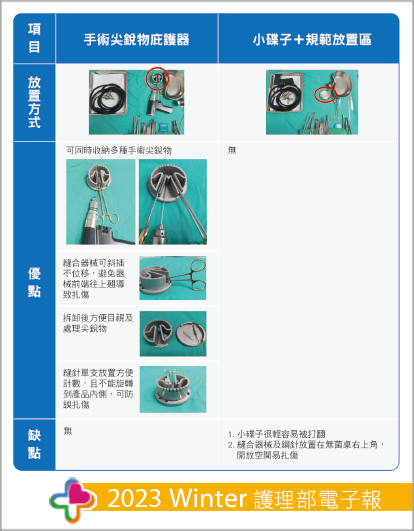 原身為骨科小組長的我,觀察發現骨科尖銳物扎傷的原因為:常用的尖銳物品在桌面擺放無固定位置、縫針及尖銳物雖然有規範專用擺放區,但因擺放區為開放空間,有時人員會因緊張,注意力不集中也會扎傷。因此某天在手術過程中,與骨科醫師林昇輝提到要為鋼針(K-PIN)找一個安全的家,讓它可以住在裡面(收納),不被外界干擾(避免扎傷),你安全我安全的概念,滿腦子創意無限之林醫師馬上答應要幫忙創新設計,經過一系列的設計創意且不斷改版,他不於餘力滿懷熱忱與團隊討論,不斷改良,終於設計了一個讓尖銳物件有一個安全保護的多功能庇護所-手術尖銳物庇護器,此多功能全方位的設計,不但能放置持針器,同時也能讓骨科之鋼針在來回傳遞間能有個適當的擺放位置,以保護大家的安全,凹槽處也能收集縫針及刀片,且尖銳物庇護器後端之設計能放置各樣式的縫針,類似掛勾方式能讓縫針安全插入,並方便計數也方便再使用,醫師的創意加上技術合作之廠商,讓手術室之創意滿分,但唯一困境就是尖銳物庇護器是需要滅菌才能上無菌台檯面,需要經過衛生醫療許可經過認證滅菌、消毒層層關卡才可以無菌使用,未來需要努力的空間還有一段距離。
