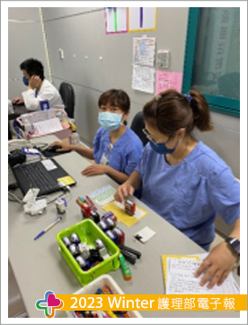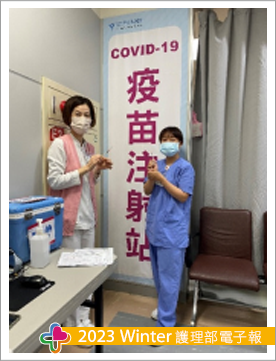 或許這個疫情雖然讓我們多了許多行政業務,但卻也讓我有了許多意想不到的「收穫」喔!這個收穫其實就是讓我跳脫病房臨床工作,然後去其他專業領域工作認識新朋友的機會。在政府力推防疫政策之下,醫院也配合執行相關防疫措施,其中「COVID-19疫苗施打」政策的推行極為重要。為了全民安全以及疫苗覆蓋率增加,院方開始招兵買馬,招募院內護理人員參與疫苗施打計畫,並安排疫苗施打專業訓練課程及提供資訊,於是我就這樣參與了其中,體驗了有別於臨床護理工作的職務。疫苗施打單位的工作相當繁瑣,隨著疫苗種類越來越多以及施打對象的不同、劑量的差異等,頭腦要相當清晰,掛號、報到、領藥、抽藥、打針及施打後衛教諮詢,樣樣都要精通,重點是就算是配戴著口罩無法清楚微笑致意,但我卻能用雙眼展現出我專業的微笑,真心覺得自己完美詮釋了這個疫苗站職務喔!