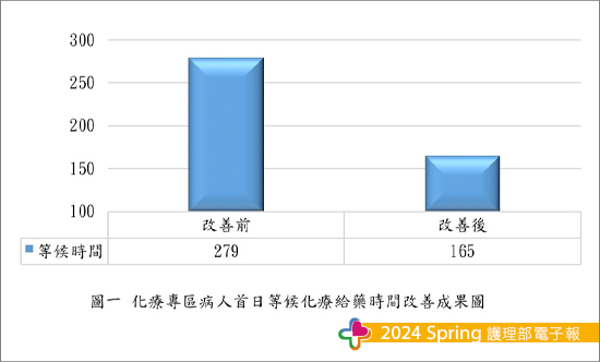 本專案之推動為院內跨單位跨團隊合作,掌握造成首日等候化療藥物時間的原因,配合文獻建議及專案人員與護理師、醫師、癌症中心、化療藥師、住院組、輸送組、資訊室等不斷討論實施多項解決方案後,縮短病人首日等候化療給藥時間從279分鐘至165分鐘,共縮短114分鐘,改善幅度為40.8%(圖一)。改善品質管理流程,減少病人等待心理壓力,縮短病人住院時間,提升住院週轉率。