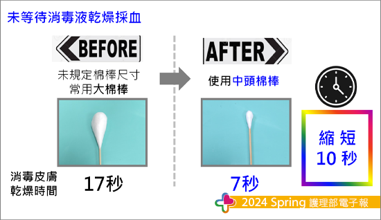 在改善策略完成後,也同時進行了圖示標準化作業、拍攝抽血技術教學影片,開始進行教育訓練,各單位也會善用相關教材,放在行動護理車的電腦桌面或者單位Line群組內,方便護理師即時查閱與學習。小組成員持續定期開會討論、追蹤執行成效,以確保改善策略的執行能夠持續維持品質改善。