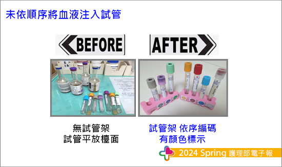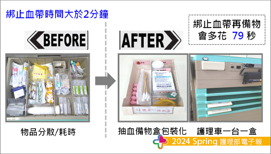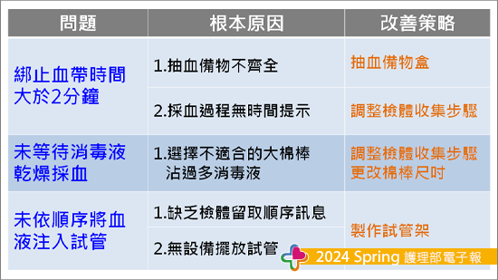統一模板共同製作將藥盒改裝成抽血備物盒,放在工作車的抽屜內隨取隨用,縮短備物時間;更改綁止血帶的步驟、使用中頭棉棒代替大棉棒來消毒,確實都能縮短執行時間減少溶血發生;使用分趾器做成試管架以顏色作為抽血擺放順序,更能固定且同時搖晃試管,來改善未按照順序及未搖晃試管造成的溶血。