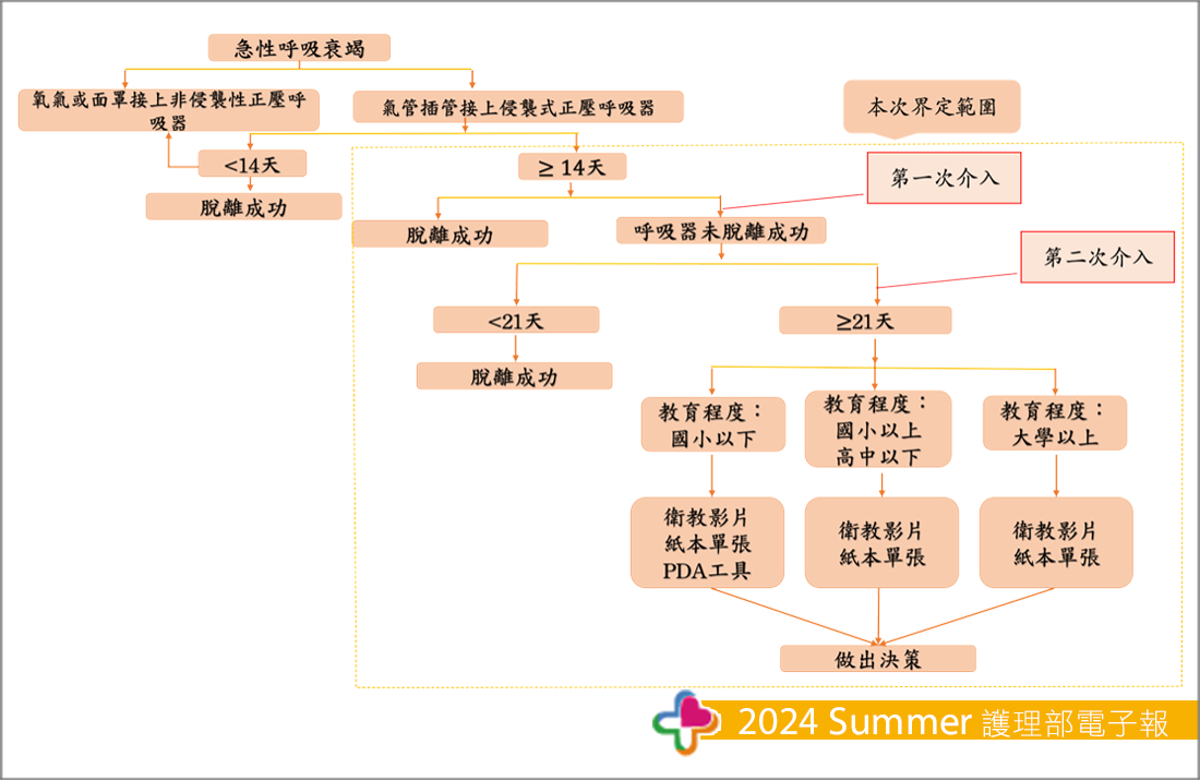 『長期使用呼吸器,我應該選擇「氣管插管」或「氣管切口」幫助呼吸?』此病人決策輔助工具於2019年經由胸腔內科、護理部、呼吸治療科、個案管理師及加護醫學部等團隊組成專案小組共同制定,同年於亞急性呼吸照護病房推行,至今已超過2年,檢視臨床實際推行狀況,發現本工具適用對象僅訂定為連續 21 天(含)以上需使用呼吸器的病人,對象廣泛,執行團隊未能精準挑選執行對象,進而無法在面臨當病人疾病可預期進入慢性呼吸器依賴狀態時,儘早啟動執行。另外,現行病人決策輔助工具參考資料已逾2年未更新,未能符合時效性,針對受測對象皆以相同方式進行說明,未能針對病人/家屬提供個別性的工具。針對上述問題,搜尋江等(2013)文獻在定義適用對象加以區分,並針對受測者區辨執行方法,標竿醫策會之決策引導工具加以優化,(張等,2021; Dettmer et al., 2017)以提高臨床實際收案數並增加執行率,本次優化期間為2022年1月1日至2023年9月30日,決策界定範圍如圖一。