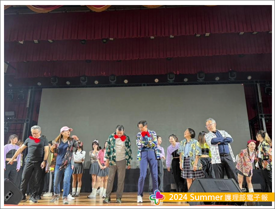 這次的主題是「帶你穿越過去與未來」,包括各個年代熱門的歌曲其中有:「跑跑跑」、「失戀陣線聯盟」、「十分鐘的戀愛」…等等,皆是各個年代火熱的音樂,一路串連到新一代的「Queen Card 」及「求佛」,每首歌都帶給大家歡樂,更讓人熱血沸騰。為了讓演出更加精湛,我們團結同心、互相學習及鼓勵,除了達到完美的演出,最重要的是能維繫各單位的感情。除此之外,各單位的護(副)理長與督導,不厭其煩地陪著我們一起排練,還幫我們準備許多精神糧食與飲品,讓我們精神百倍!還有要感謝福委會的長官們,透過一次次的彩排,不斷提醒、鼓勵與建議,讓我們的演出增添許多色彩。
