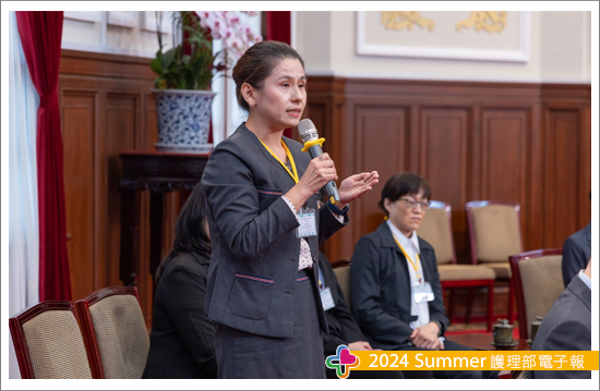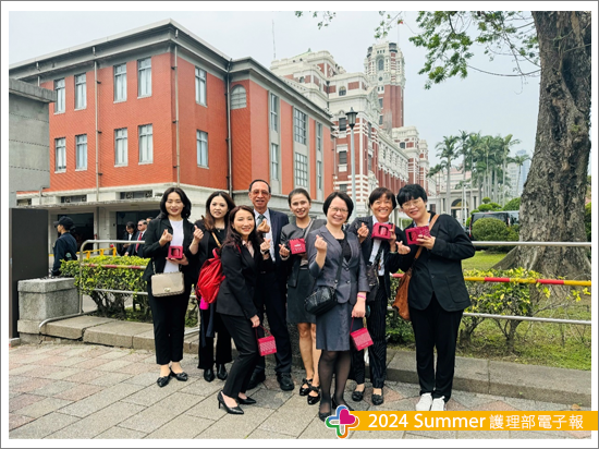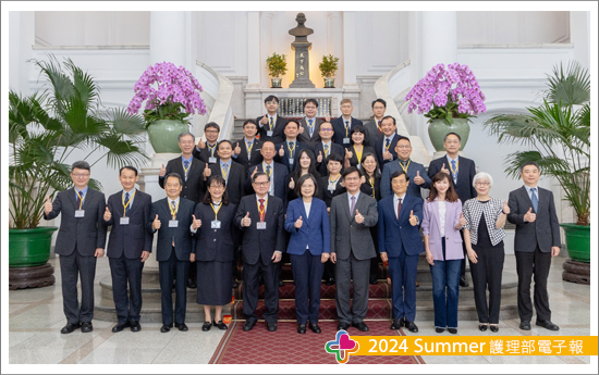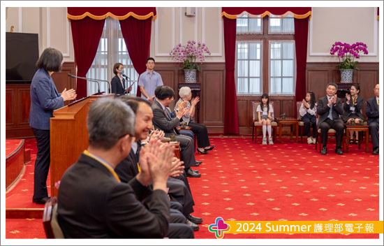 與總統座談的互動時間中,由我代表以護理發明家的身分跟小英總統與各部會首長建言,首要懇請政府持續支持護理人員研發創新,協助跨業開發以智慧輔助照護減輕護理人員工作負荷,不但能持續優化醫療職場環境,同時亦可鼓勵「護理中高齡(已退休或育嬰中斷第一線工作)的人員有自信與動機回流職場」,如:勞務輔助機器人或護理作業整合平台,期許各類產業能積極跟醫療產業攜手合作,開發有機會落地的實用產品。而總統給出非常友善的回應,同時強調「護理師」非常重要,也非常重視我們提出的建言,於是,我順勢也將醫療現況的困難提出,護理人力持續的短缺,等於守護民眾健康的防火牆亮起警訊,期望開放男性護理師在醫院服替代役,留職留薪,避免因服役中斷執業。另外,務必提升護理人員整體薪資,讓國高中生願意報考護理系,而薪資是決勝點,期待應屆畢業護理師年薪至少達70萬(不含夜班費),資深人員按比例調整,由政府編列預算優先補助醫院護理人員薪資,每人每月10,000元直接撥入個人帳戶鼓勵留任,醫院亦可適度調整薪資。總統已經交代首長們持續努力,讓護理人力能夠慢慢回流,讓我呼籲與強調「投資護理」得到總統正面的回應與支持。後續安排與總統合影時,林佳龍祕書長主動跟我握手互動,並引薦我們跟小英總統說明,我們奇美來了很多人,且去年也有人來,我回應這次有8人,也跟總統介紹我們的團隊,總統說我們的表現很優秀,持續會關注護理的議題,這次進總統府能夠為創新研發與護理專業發聲,內心的激動與澎湃難以言喻,在此特別感謝行前要與總統座談的議題由陳綉琴副院長與馬淑清部長(亦為現任護理全聯會的副理事長)提供建議與指導。