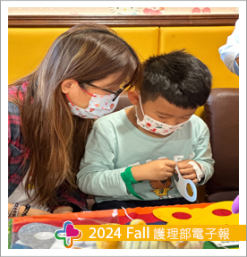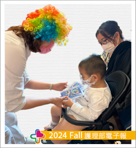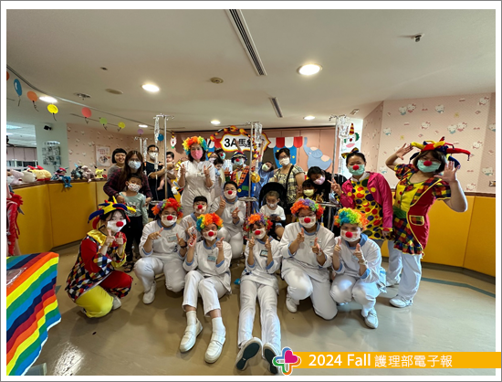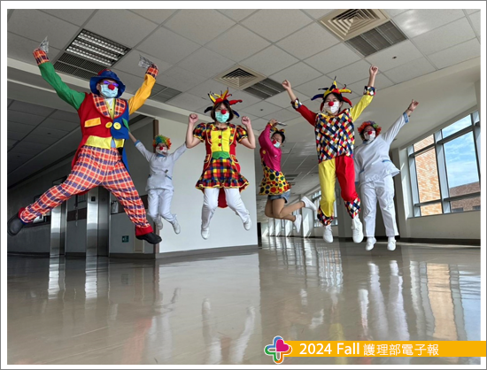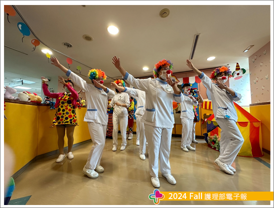 一年一度的兒童節是孩子們最重視也最期待的日子,今年以馬戲團為主題,兒科病房醫護人員褪去白色制服,穿著花俏、色彩鮮艷、華麗奪目的服裝,目的是希望吸引孩子們的目光與注意力,活動內容藉由帶動唱,以及家長帶著孩子共同手作專屬面具,讓孩子們及家長可以減緩疾病的不適與住院的壓力,同時促進親子間的關係。