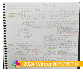 在外科病房實習原本有四週的時間,沒想到第一週竟遇到三陀兒颱風的攪局,讓實習時間壓縮,但學習目標依舊,該交的作業一項也沒有少,老師說一定會陪我們運用這段期間努力完成挑戰。我們的實習日常除了完成每日的臨床常規,實習護生的目標,須將學校所學及現在的臨床照護、相關知識學理融會貫通,以應用在外科不同疾病的照護,為了能串聯手術前、後護理的重點,在老師的指導下,我們運用圖像化的筆記,以病人為中心從頭到尾將照護重點書寫記錄下來。寫完筆記後,讓我們能將手術前後的病人照護需求,徹底思考一遍,之後拿起來複習仍意猶未盡。
