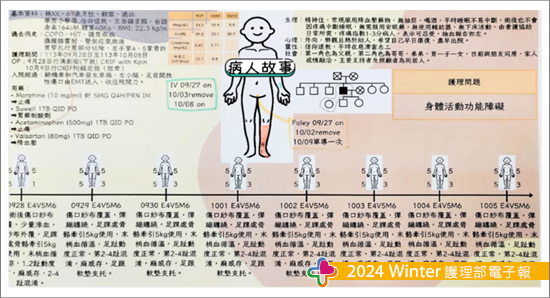 實習作業的重頭戲是完成一份個案報告,以往個案報告都是用Gordon 11項健康功能評估為架構,以文字為主的方式書寫,這次老師教我們用一張A4版面完成一位病人的故事,故事內容從病人的生理、心理、社會、靈性方面進行評估,從評估過程向病人學習,了解到病人對病情的看法、如何看待人生,生病的影響、結論出護理問題,再寫護理計畫,因此讓自己對個案的照顧及狀況更加了解而感到踏實;最後將病人故事以圖加文字呈現,看到自己將病人故事濃縮在一張A4版面很有成就感,也覺得病人就像一位人生導師,給我上了一堂課堂外的人生課題。