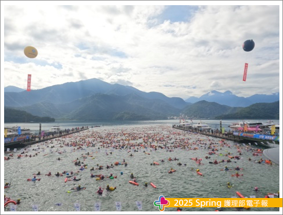 隔日清晨,換上泳裝,背起浮條,我們出發前往潭邊活動會場,迅速檢錄及登錄晶片後等待下水,那時我腦海裡充斥著對於下水後的想像,我感受到水下壓力帶給前胸的緊迫感,冰冷水溫使身體不自主地顫抖,最可怕的是那體力耗盡時的疲憊感受,此時緊張感真是到了最高點。終於大會倒數3、2、1,「日月潭公開水域錦標賽」正式開始!日月潭頓時成了一鍋滾燙熱水,我們是那準備下鍋的水餃,場面之壯觀,下水後果然如想像般煎熬,甚至多了一個水下深不見底,雙腳懸空的感受,我必須努力抓緊浮條並控制身體,但緊張感似乎被冰冷的潭水冷卻了,我告訴自己:開始拚盡全力的游吧!第一個1000公尺,大概是在找尋最舒適的前進方式並且適應深不見底的感覺,由於人潮眾多,前進速度緩慢,於是所幸以一個潭中視角,欣賞了一會兒日月潭360度環繞景色,第二個1000公尺,我開始集中精神於速度上,正當我全神貫注的調配換氣時,突然間,我喝到了一大口潭水!雖說沒什麼特別的味道,但看著能見度僅1公尺的土黃色混濁潭水,想著可能有人邊游泳邊尿尿,加上一些水中的浮游生物,一股噁心感瞬間湧出,內心極為恐懼、厭惡,但又必須調整心態,繼續前進,如果說一個最難受的過程,絕對非此莫屬,此刻的我真的很堅強,最後的1000公尺是體力上最艱難的時刻,剩下的500公尺幾乎是靠著意志力,但算著時間,我知道自己游得完,心情上是放鬆且興奮的,我非常享受這個卯足全力的過程,就這樣我游到終點了。