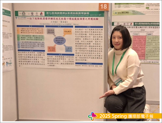 身為單位傷口種子的我,於去年傷口種子的課程中,參與了各單位書寫個案傷口相關海報的活動。在單位主管的鼓勵及協助,和國內外海報發表資訊的引導下,有幸到國外進行海報發表。本次參加「第七屆海峽兩岸暨港澳地區護理論壇」投稿,此論壇每年舉行一次,目的是加強華人地區護理人員的聯繫和溝通,推動護理專業的共榮發展;此由台灣護理學會、香港護理學院、澳門護士學會及中華護理學會四會輪流辦理,2024年輪由澳門護士學會主辦。得知發表地點在澳門時,心情既期待又忐忑。在完成線上投稿後,開始了長達兩個月的等待,當終於收到海報發表被接受的回覆信件時,內心充滿雀躍與期待。