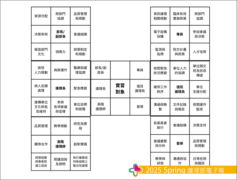 可能有人會問:「這段實習我究竟學到了什麼?」其實,跳脫了制度與文化的差異,我發現無論在哪個領域,都有值得學習的地方。透過九宮格學習法,我為自己設定了在各位指導者身上所學習的能力目標,並逐步加以實踐和內化。在參與行政會議時,學習如何系統性地思考政策的可行性,特別是在制定年度目標中,需以具體數據佐證每項提案的價值促進照護品質,並結合臨床實務需求,這需要紮實的實證基礎。我也有機會透過引導學習單位和人力管理,以及跨單位的協同能力,了解到如何在資源有限的情況下,透過精準的規劃來確保工作流程的順暢運作。同時,我觀察到以同理心與溝通技巧的管理方式,與基層護理人員之間的緊密連結讓我深受感動。此外,我還在時間管理與領導力方面獲益良多。實習期間跟隨主管參與了多場不同性質的會議,他們在繁忙行程中仍能分配時間處理每件事務,並以清晰的目標引導討論,讓團隊成員聚焦在具體目標上。