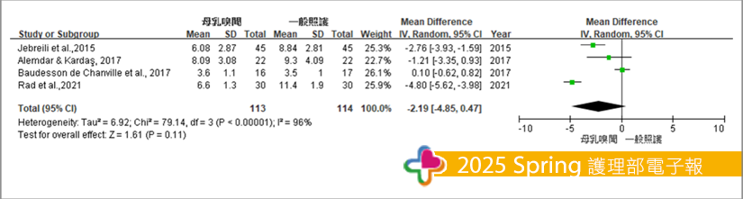 因其中一篇文章未提供有效數據,故僅納入四篇文章進行統合分析,由於研究結果之間具有高度異質性(I²=96%),因此使用隨機效應模式(random-effects model)合併結果並計算95%信賴區間為−4.85~0.47,因信賴區間跨0,最終結果顯示母乳嗅聞對疼痛緩解無效,然而,結果亦表明「母乳嗅聞」組的疼痛分數普遍比「一般照護」組低,顯示母乳氣味可能有一定的止痛效果。