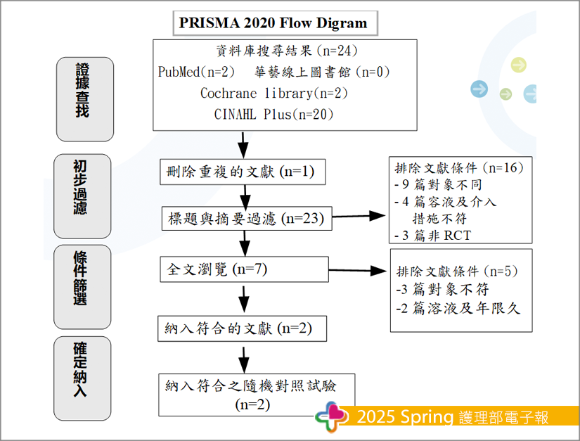 運用實證護理步驟,首先以 PICO 架構形成一個可回答的臨床問題:「放射線治療之頭頸癌病人使用綠茶水是否可改善口腔黏膜炎」。族群(Population):接受放射線治療的頭頸癌病人;介入措施(Intervention):使用綠茶水進行漱口;比較措施(Comparison):無對照組;結果指標(Outcomes):改善口腔黏膜炎。使用自然語言、PudMed MeSH Datebase 找出 MeSHterm 設定中英文關鍵字及同義字(表二),並搜尋資料庫,搜尋包括:PudMed、 Cochrane Library、CINAHL、華藝線上圖書館。搜尋策略方面,先將「族群 P」、「介入措施 I」、 「結果指標 O」各自同義字以「OR」進行連 結、再以「AND」連結交集,提供全文、設定為隨機對照試驗(Randomized controlled trial)與統合分析文獻(Meta-analysis)。排除非頭頸癌之放射線導致的口腔黏膜炎之學術摘要。透過上述搜索策略,刪除重複之文獻,閱讀題目與摘要,並依納入及排除條件,最終共計2篇RCT文獻進行評讀,文獻搜尋流程圖祥見圖一。